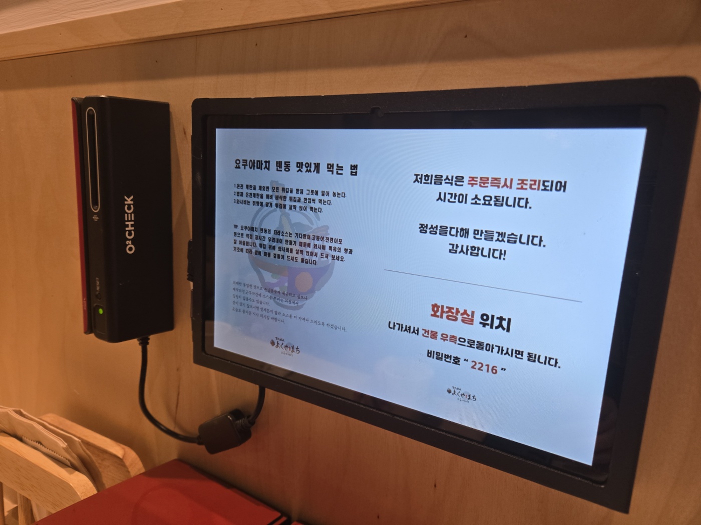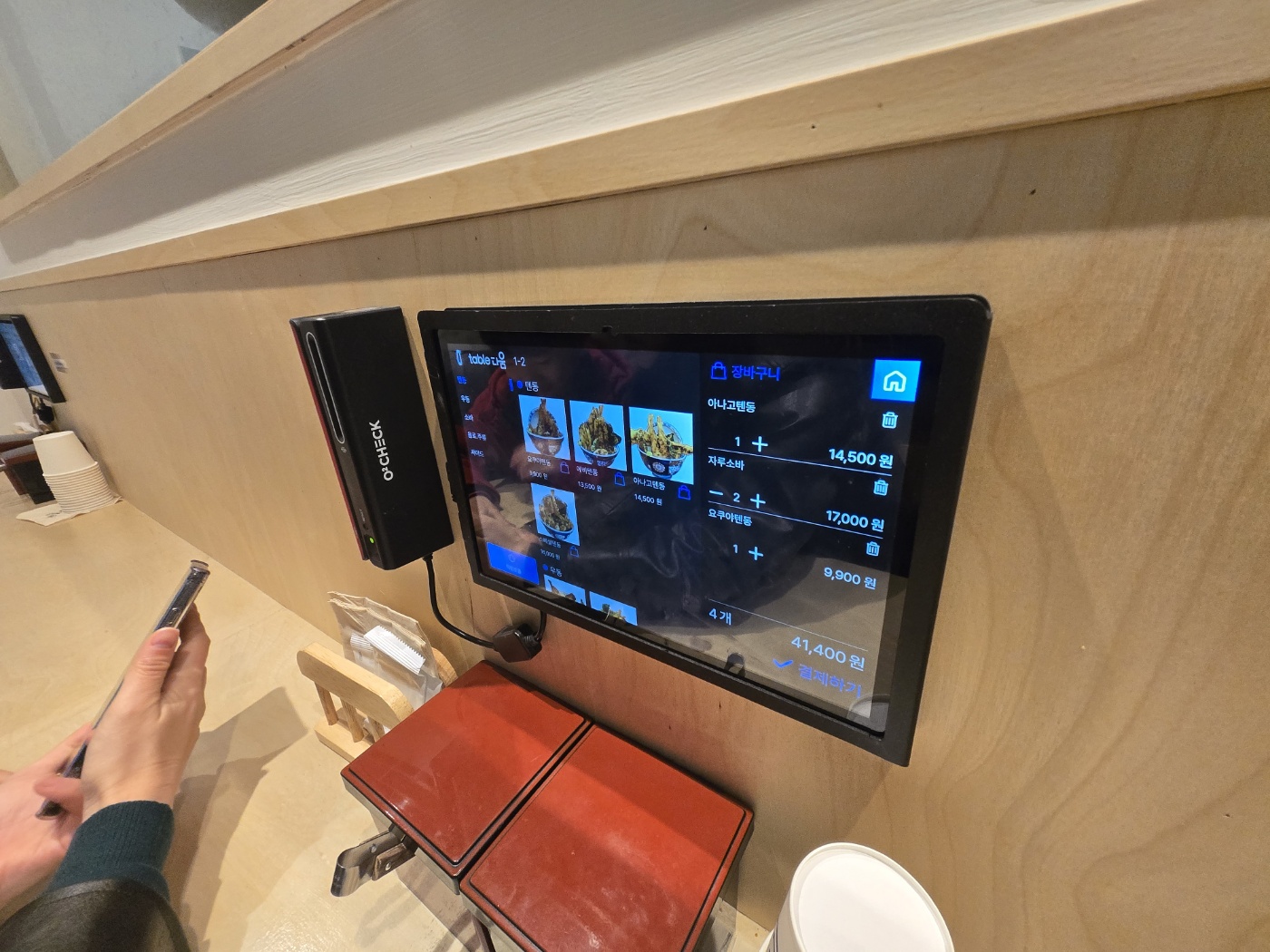 특이한 점은 터치스크린 주문 시스템이 도입되어 있다는 것이다. 테이블마다 디스플레이가 설치되어 있어 메뉴를 쉽게 확인하고 주문할 수 있다. 또한, 주문 후 음식이 조리되는 과정에서 기다림이 필요하다는 안내도 제공된다. 특히, 터치스크린에는 텐동을 맛있게 먹는 방법이 안내되어 있어 그대로 따라 하면서 최상의 맛을 경험할 수 있었다.
